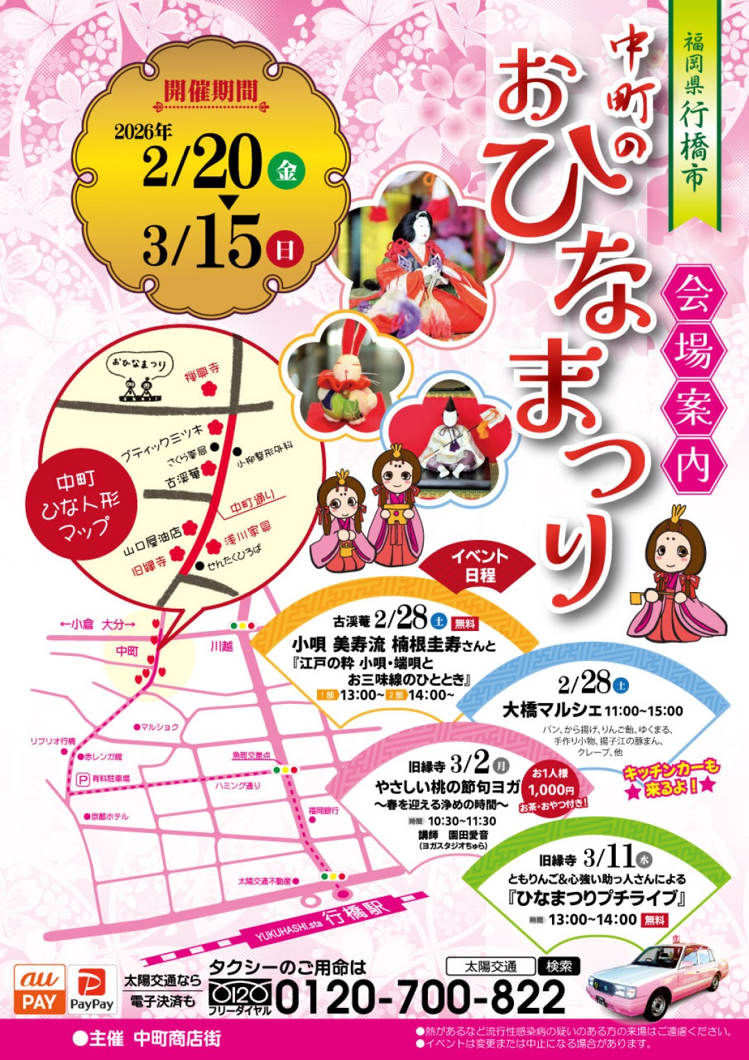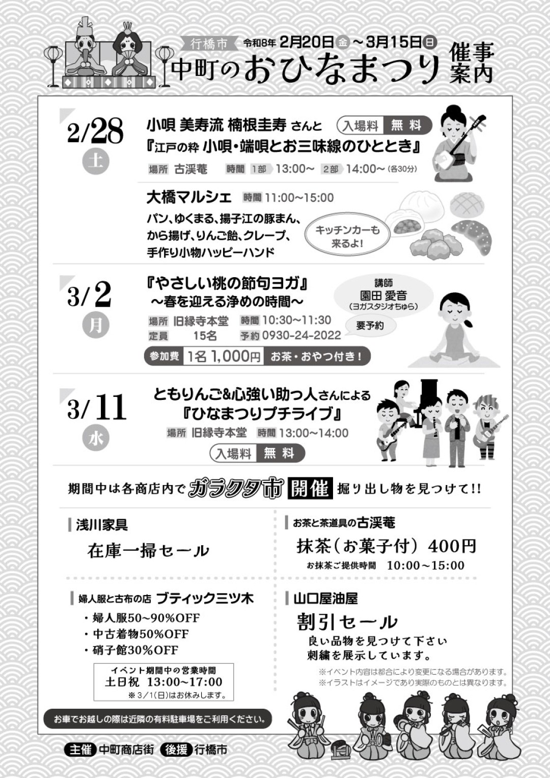 2月28日の「大橋マルシェ」や小唄の演奏、3月のヨガやプチライブなど、心温まるイベントも盛りだくさんです。春の訪れを感じに、ぜひ中町へお越しください。