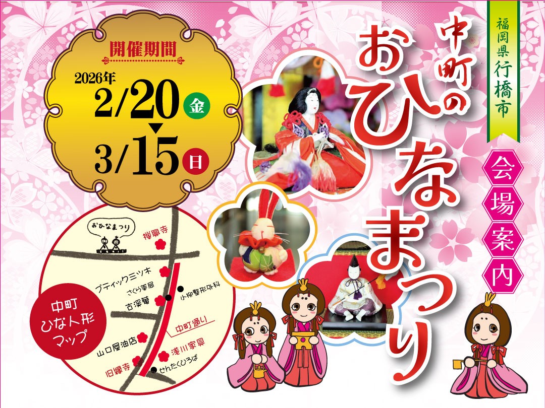 早春の中町を彩る「中町のひなまつり」が今年も開催されます。期間中は中町一帯に雛人形が飾られ、情緒豊かな街並みを楽しめます。