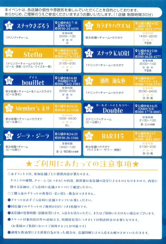 行橋駅近郊のスナック・ラウンジ26店舗で『お試し企画』開催。