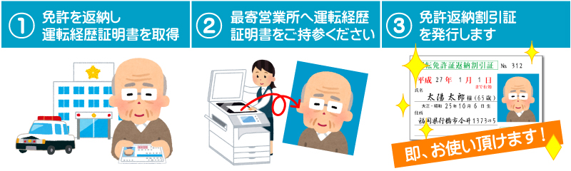 - ①免許返納後に警察署から発行される運転経歴証明書を取得。