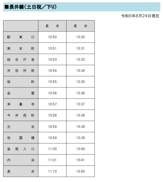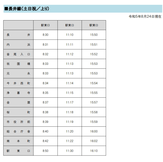 - 路線バスは一般交通網で運行されるため、道路状況の影響を受けやすく、時刻表通りに到着しない場合があります。
