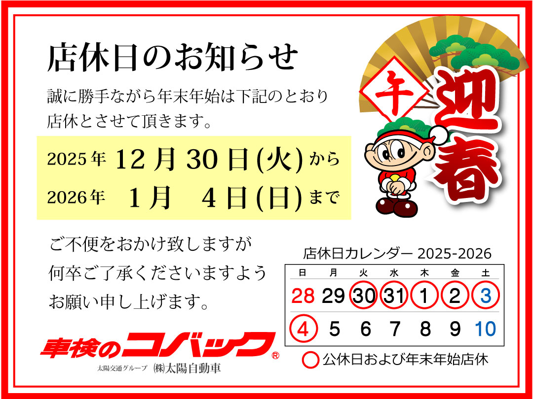 また、12月29日は車検・整備のお預かりが難しい場合がございます。