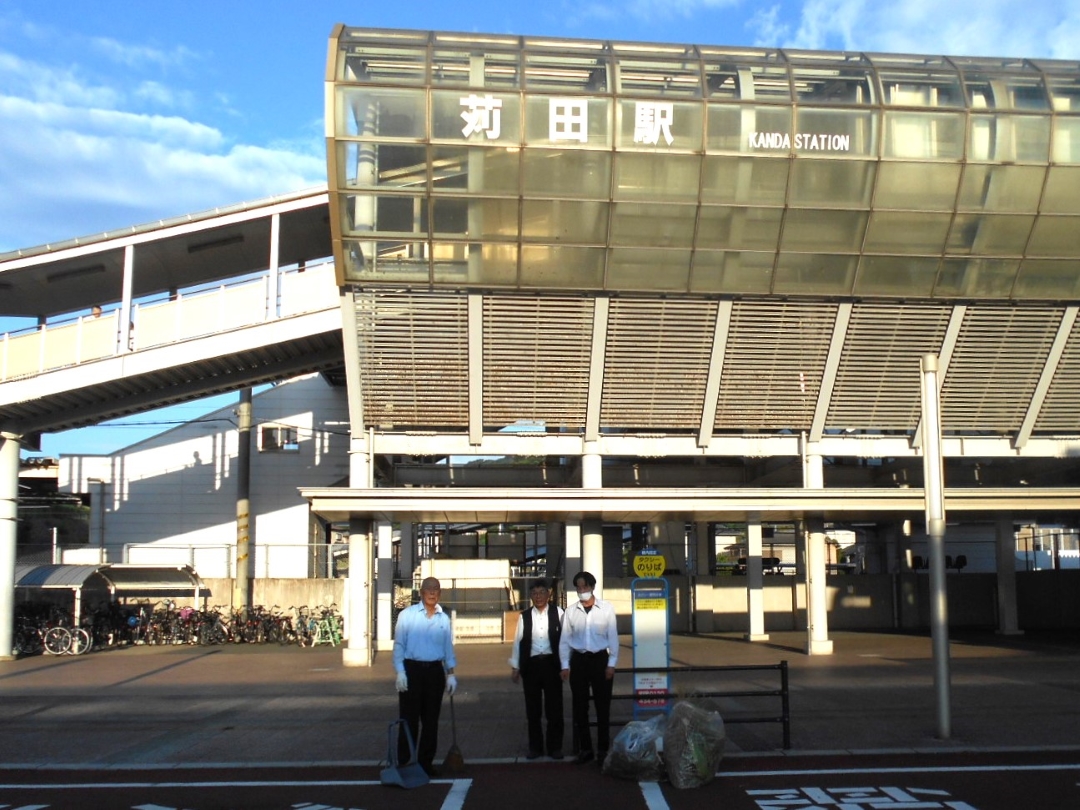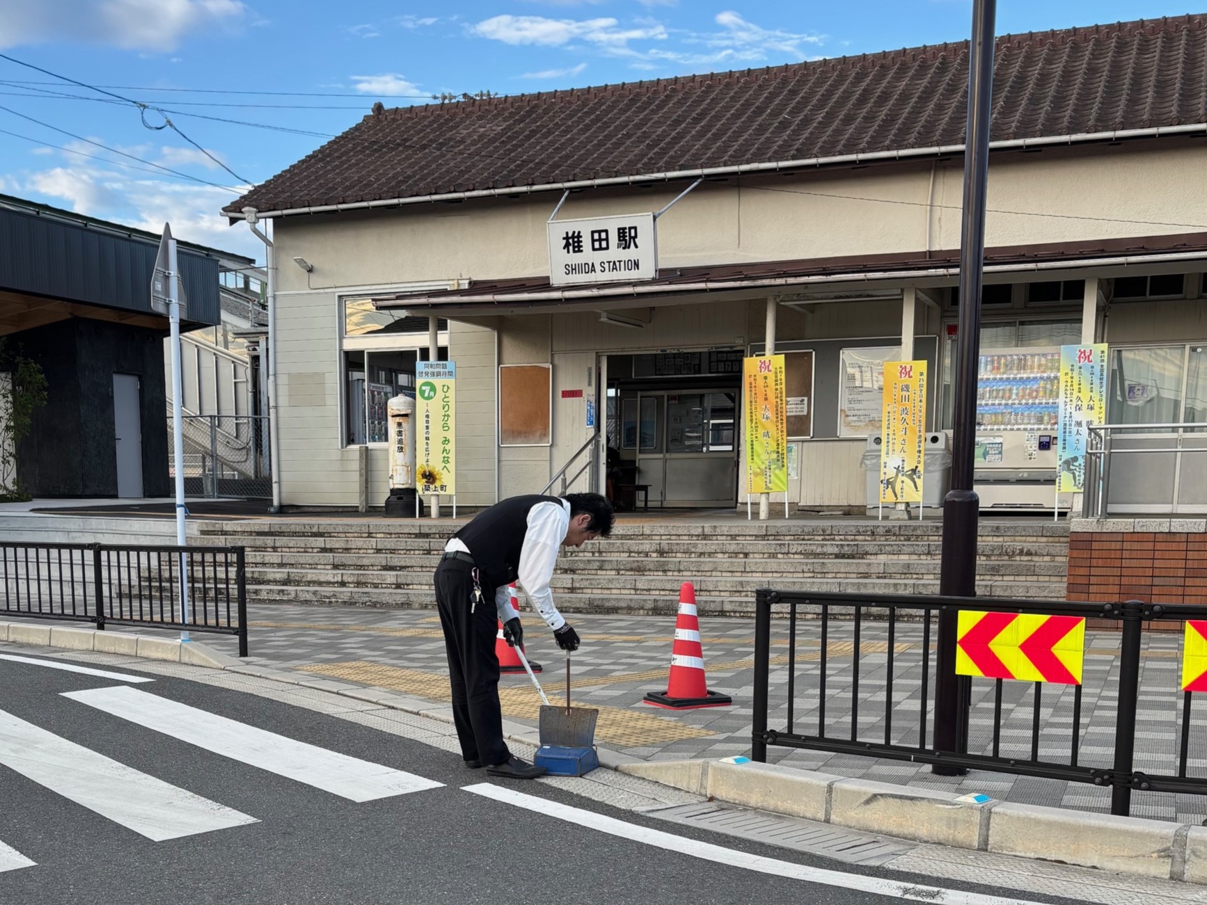 - 京築タクシー協会会長でもある堀社長は、行橋駅の清掃に参加しました。協会会員や自動車販売店のトヨペット様からもご協力を頂き、ともに清掃に励み、地域への感謝の気持ちを形にしています。