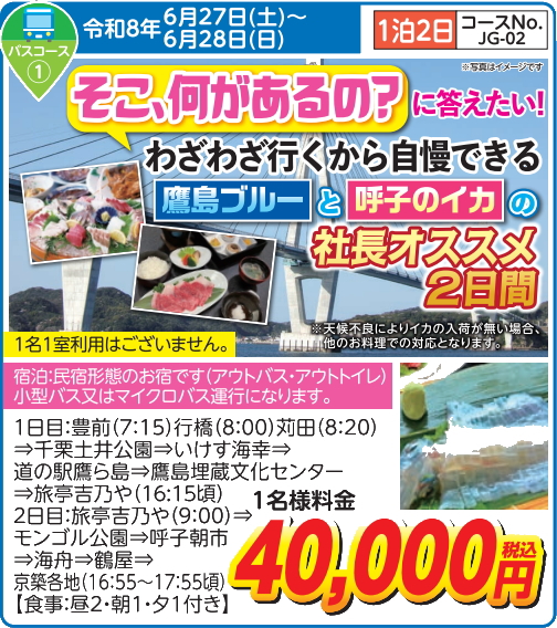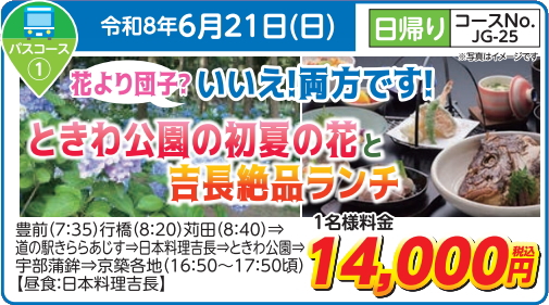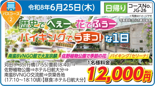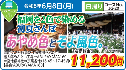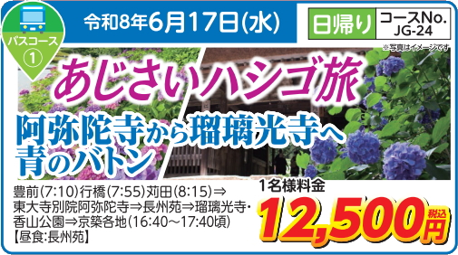 / 最終更新日時 : staff 6月 京築発「令和8年6月の旅」 各ツアーについてのお問い合わせは太陽旅行まで、お気軽にどうぞ!>店舗案内はこちら チラシダウンロード(PDF) プランの最低催行人員は20名です(※募集人員が最低人員を下回った場合は不催行となる恐れがあります)。ご利用条件をご一読ください。 FacebookXBlueskyHatenaCopy