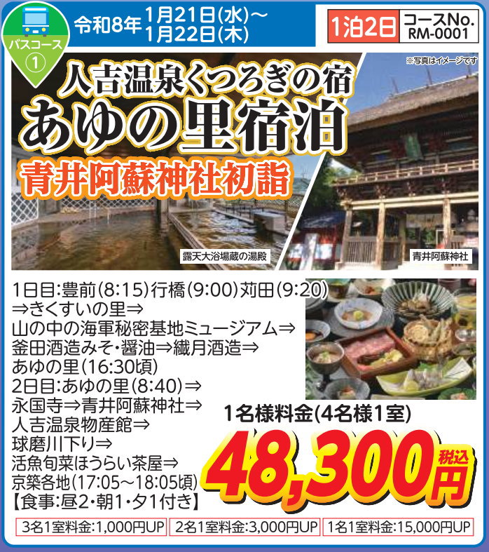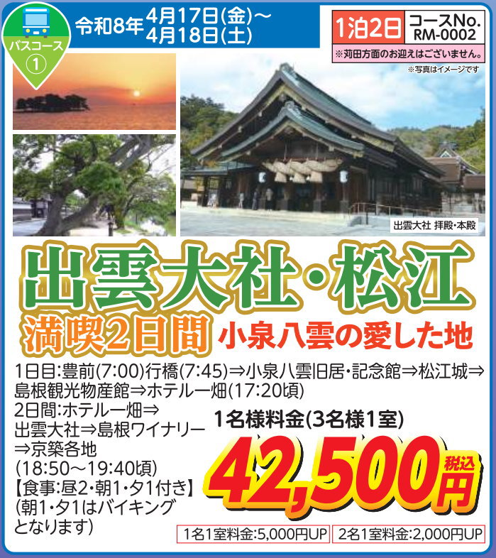 ゆっくりお楽しみ頂ける、今シーズンのおすすめコースです。 1月21日発:あゆの里ご宿泊プラン 4月17日発:ホテル一畑ご宿泊プラン チラシダウンロード(PDF) プランの最低催行人員は20名です(※募集人員が最低人員を下回った場合は不催行となる恐れがあります)。ご利用条件をご一読ください。